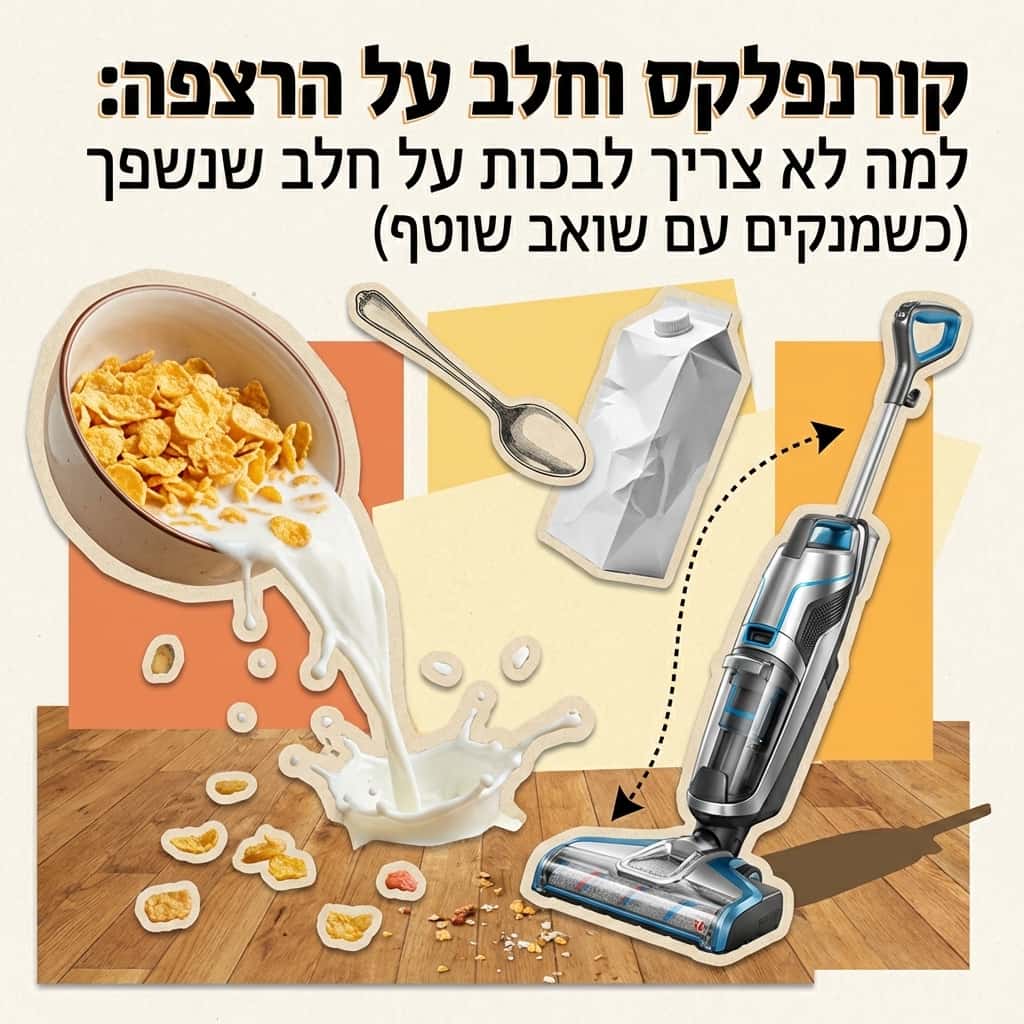 הקורנפלקס הוא רק הדוגמה הקלאסית. כל מי שמנהל בית פעיל יודע שהמטבח הוא שדה קרב של נוזלים ומוצקים. קטגוריית מוצרים לבית עברה אבולוציה משואבים פאסיביים למכשירים אקטיביים שיודעים להתמודד עם מגוון רחב של תאונות קולינריות. הנה כמה דוגמאות ל"אסונות" שהשואב השוטף פותר בשניות: