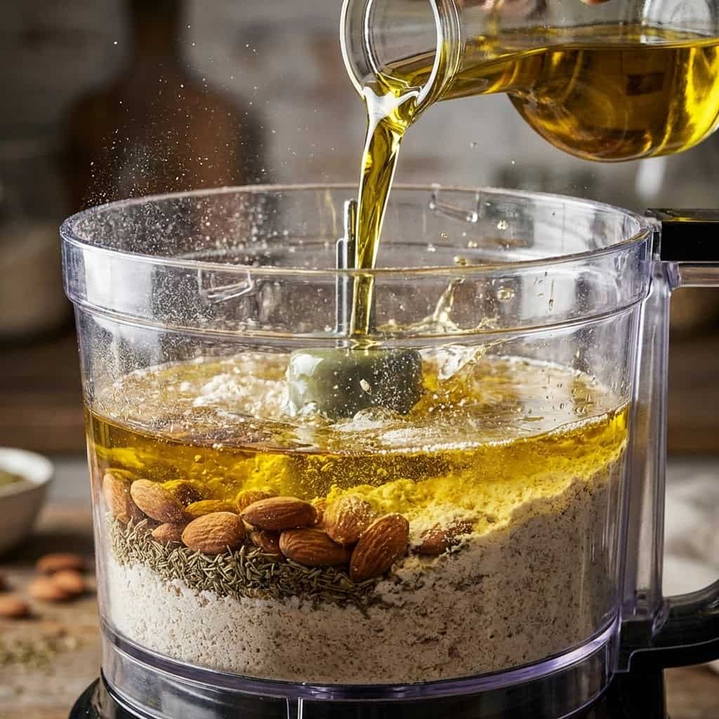 המרכיב הקשה: מתחילים עם חומר הגלם העיקרי (גרגירי חומוס מבושלים, אגוזים קלויים, בזיליקום לפסטו). טוחנים אותם לבד עד שהם הופכים לפירורים דקים או למחית גסה. בשלב הזה אין נוזלים שמפריעים ללהב "לתפוס" את הגרגירים.